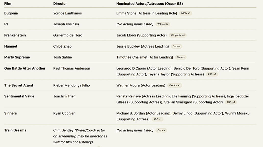 Here’s a quick cheat sheet for Best Picture nominated film and actor categories.