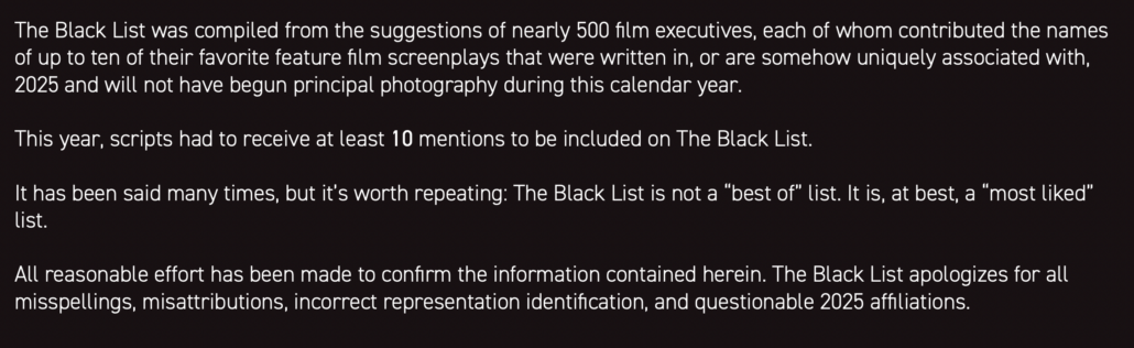 SCREENMANCER ICYMI NEWS: Yesterday the 2025 top 74 un-produced screenplays were announced by The Black List as The Black List 2025. Why they couldn’t get to 75 should be a bit some comedian picks up. But 74 it is. What is The Black List? Funny you should ask because they have an entire promo asking that very question.